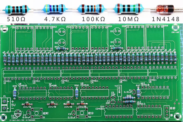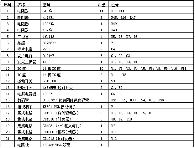 有正负极的元件:发光二极管和电解电容的长脚是正极,对着电路板上标+的位置,1N4148带黑圈的位置对着电路板上带白色标记位置。