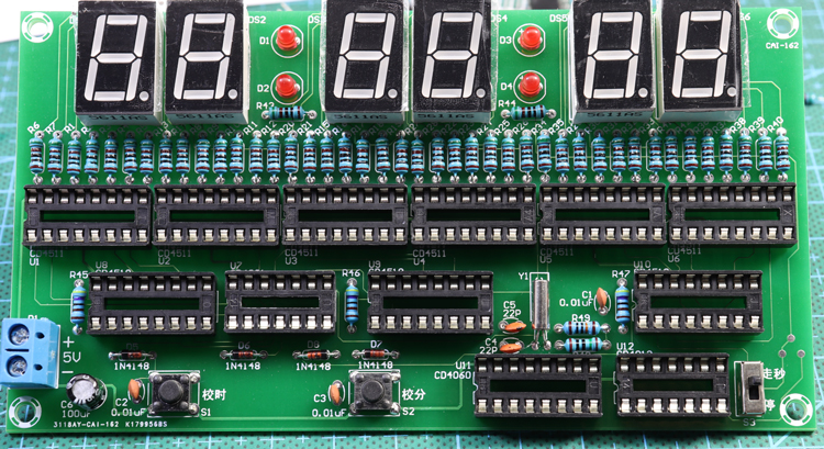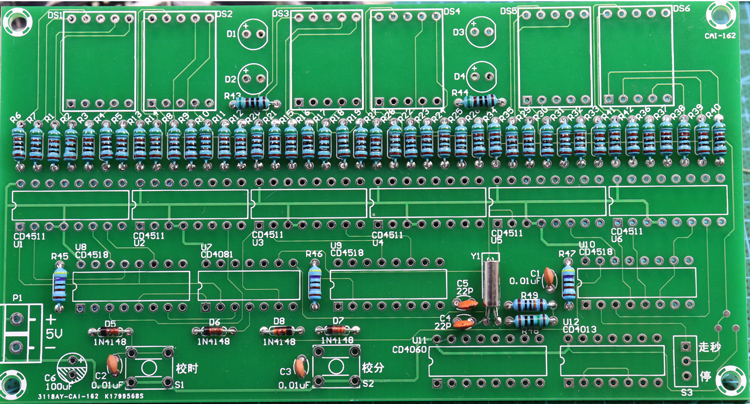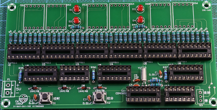 按元件清单的顺序焊接,先装矮元件再装高元件。集成电路先安装管座,最后再将集成电路装在管座上。