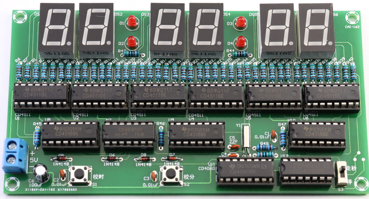 本电路采用石英晶振作为时基脉冲震荡器,通过数字分频后取得秒时基信号。再通过计数器、译码器及显示器将时间显示出来。由于采用了晶振作为时基脉冲,所以走时时间精准。