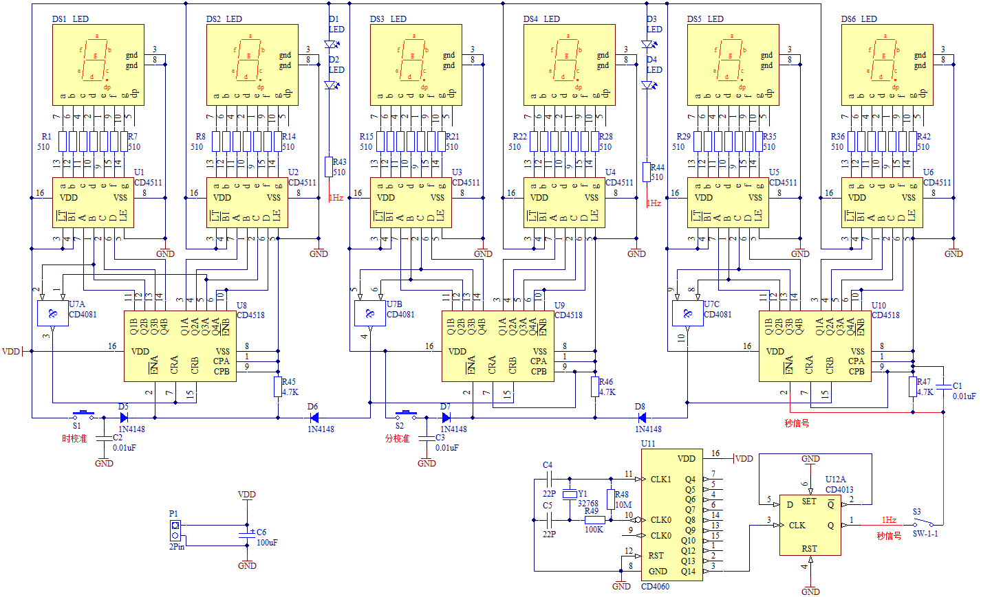 秒信号发生器由CD4060和CD4013组成,产生频率为1Hz的和时间基准信号。CD4060是14级二进制计数器/分频器/振荡器。它与外接电阻、电容、石英晶振共同组成32768Hz振荡器,并进行14级二分频,再外加一级D触发器(CD4013)二分频,输出1Hz的时基秒信号。秒、分、时计数器电路均采用双BCD同步加计数器CD4518计数输出BCD码,通过CD4511将BCD码显示出对应的数字,秒、分计数器是60进制计数,时是24进制计数。时、分、秒的显示电路完全相同,均使用CD4511译码驱动数码管。秒校时采用等待校时法,正常工作时,开关S3拨到“走时”,进行对秒信号校对,将S3拨到“停”,待标准时间一到,立即拨到“走时”位置,恢复正常走时。分和时通过开关直接输入脉冲信号校准,每按一次开关,加一次数。